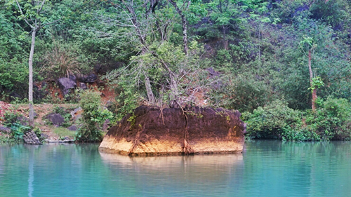河中這塊巖石像刀切一樣整齊,上有一樹,人稱小蔥拌豆腐,明明就是一塊臭豆腐。